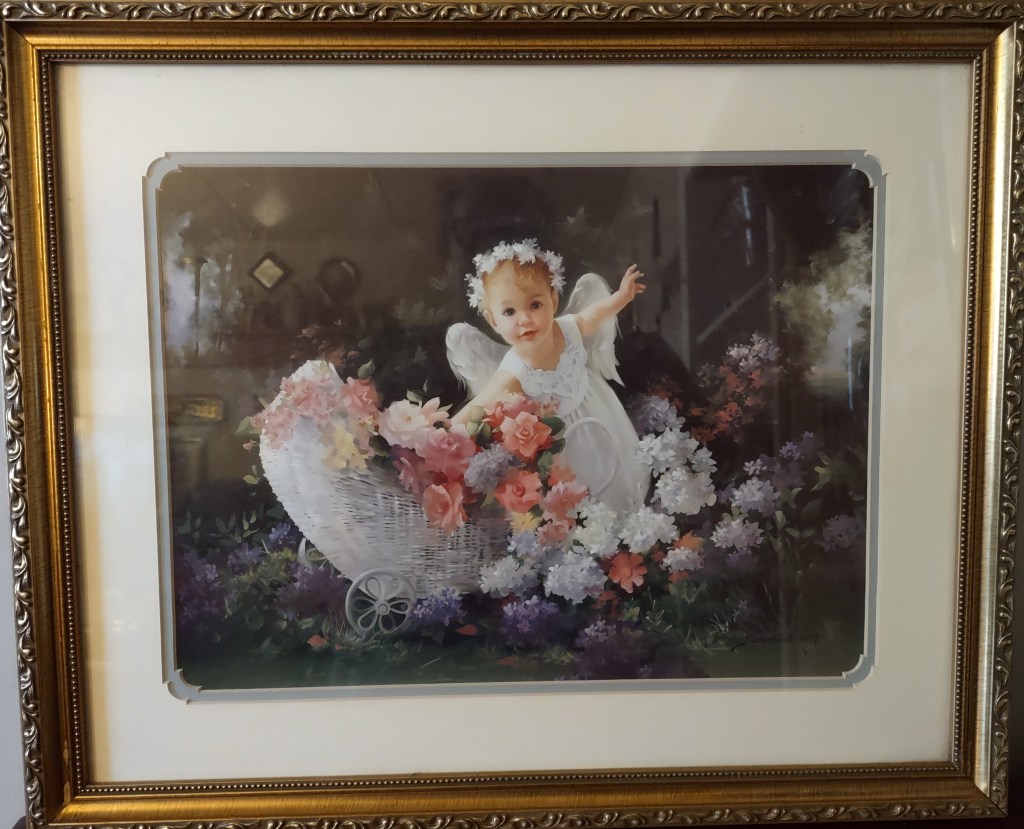 WP 0002 Home & Garden “Cherib In Flower Garden” Wood Frame L18 X W22 $4.00
