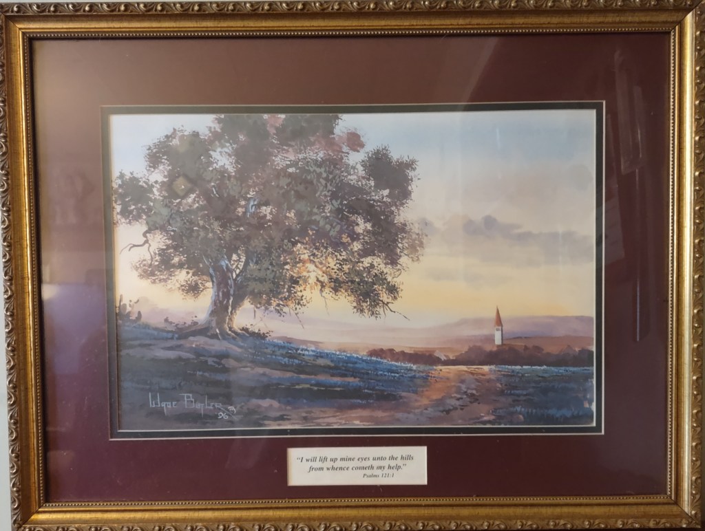 WP 0003 Home & Garden ” Tree In Field With Church Steeple In Background” Psalms 121:1 At Bottom L19 X W25 $4.00