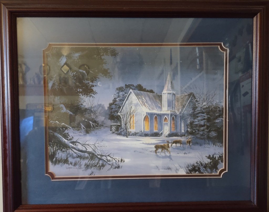 WP 0004 Home & Garden ” Country Church With Deer In Front And Car At The Side” L19 X W22.5 $4.00