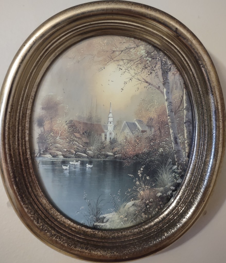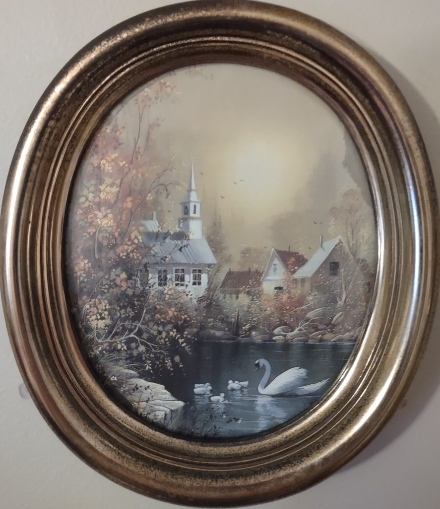 WP 0013 Home & Garden “Swans On Pond Town In Background” Plastic Frame L8 X W6.5 $1.00