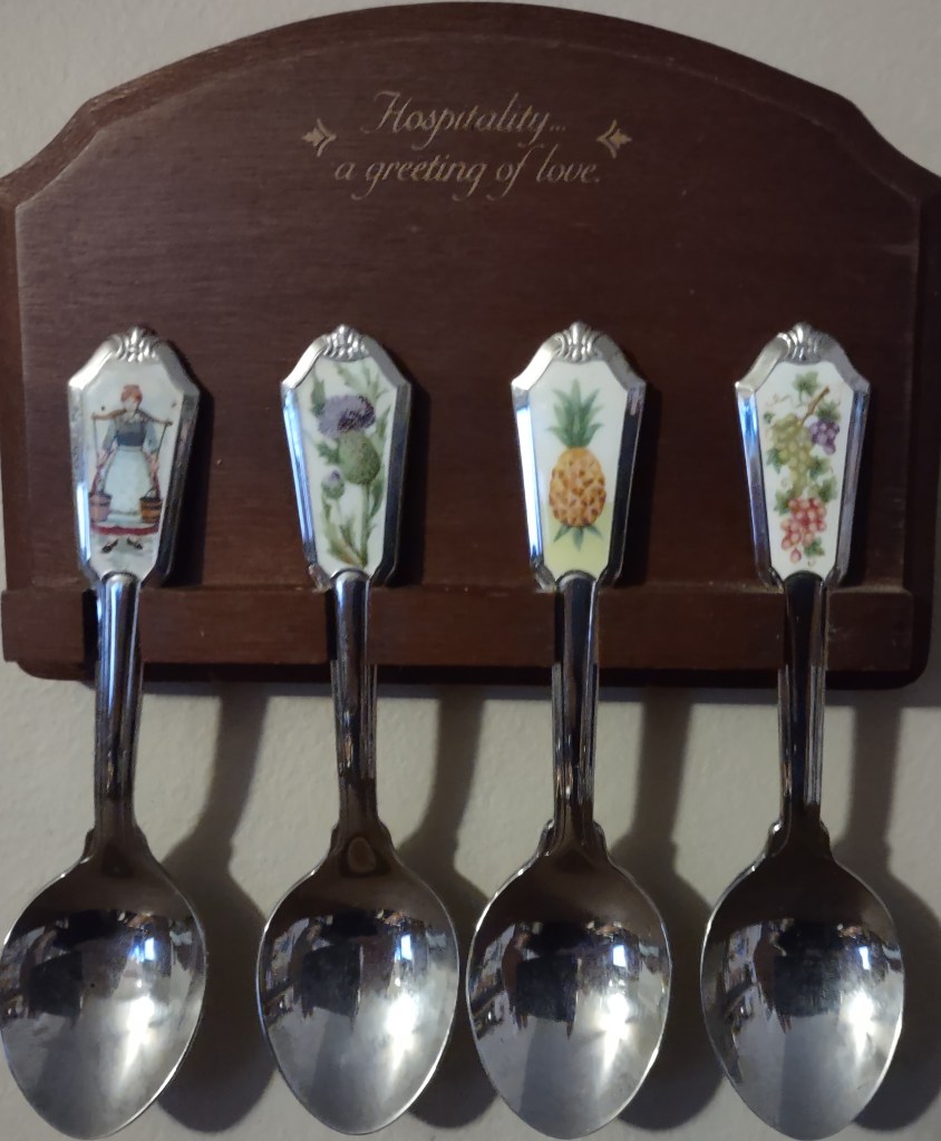 WP 0018 Avon Plaque 1985 Quote “Hospitality… a greeting of love” 4 spoons “A Lady Carrying a Bucket, Flowers, Pineapple, Grapes” $2.00