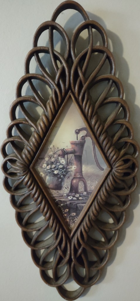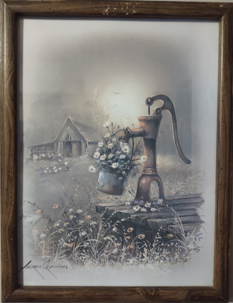 WP 0022 Water Pump And Barn In Background Wood Frame L17.5″ W13.5″ $2.00