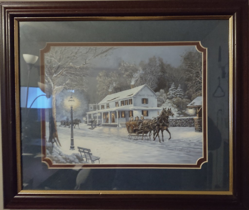 WP 0023 Home & Garden Party “Winter Scene Horse Drawn Sleighs In Front Of Inn” Wood Frame $2.50